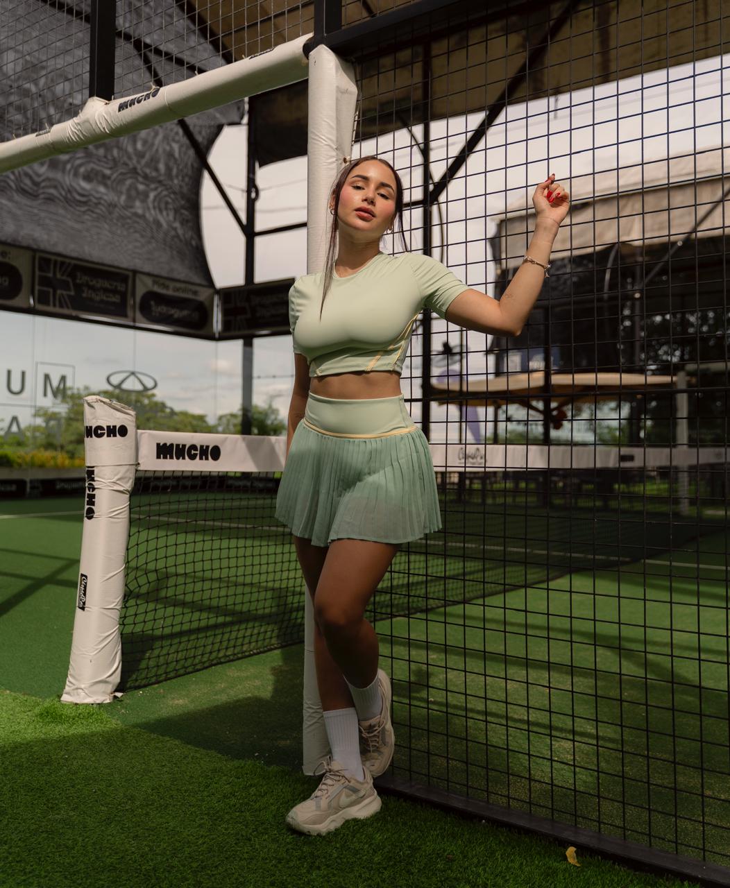 El Set de Falda Elite combina un top deportivo ajustado con una falda ligera y moderna, diseñado para ofrecer comodidad y estilo durante entrenamientos o actividades casuales. Su tela fresca y de secado rápido permite moverte con libertad, mientras que el short interno brinda seguridad en cada jugada.